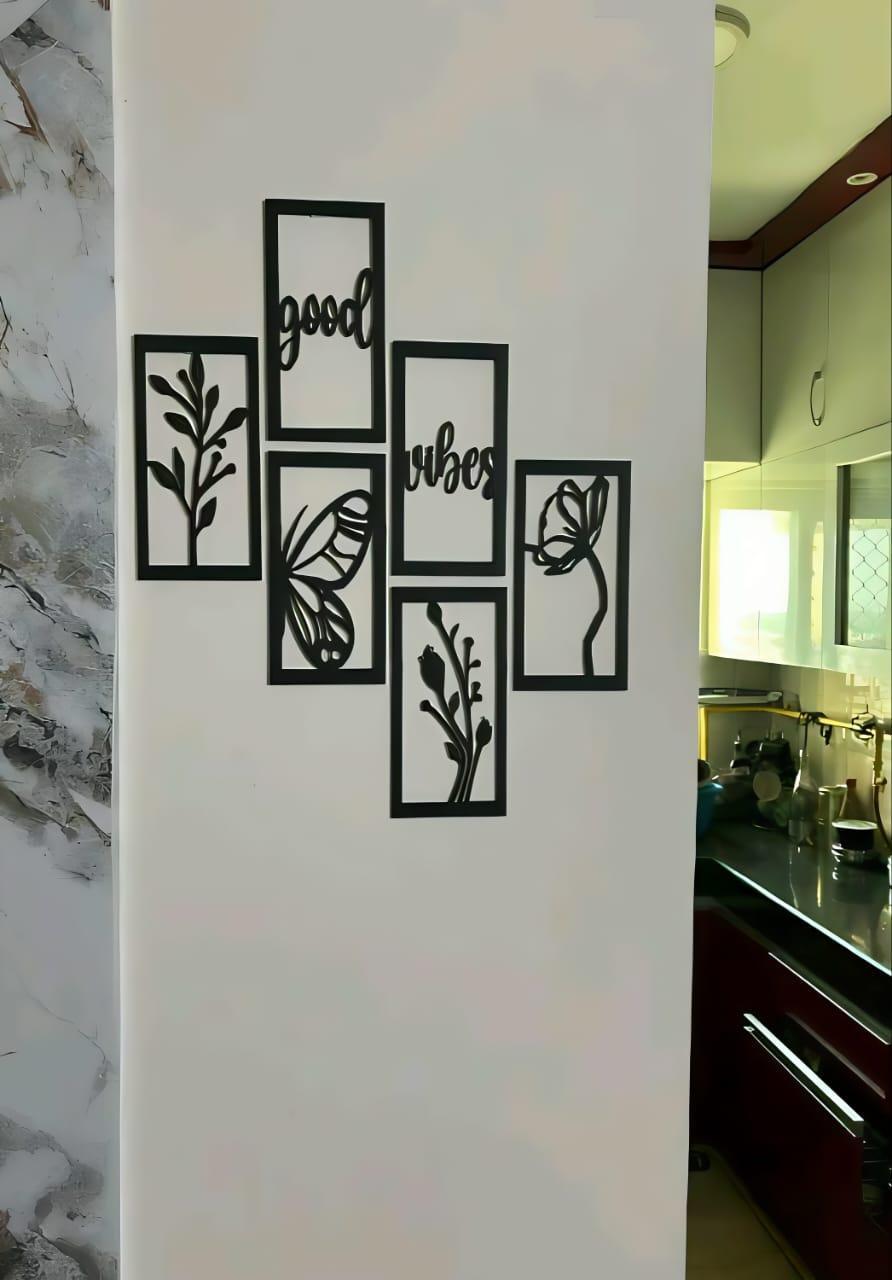 "Good Vibes" Butterfly & Floral Wall Art 6-Piece Frame Set | Black MDF Wood 26x20" | Abstract Design